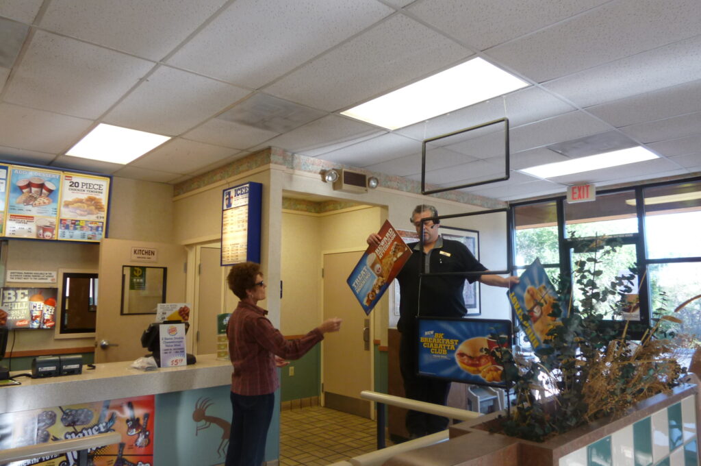 英語で上手く伝えられない私たちは、きんさんにレジの列に並んでもらって、ルルが看板の近くに待機し指で示そうという作戦にでた。ところが背の低い私は一生懸命になるあまり、ひっぱりすぎて看板が天井から外れて落ちてきてしまったのだ。