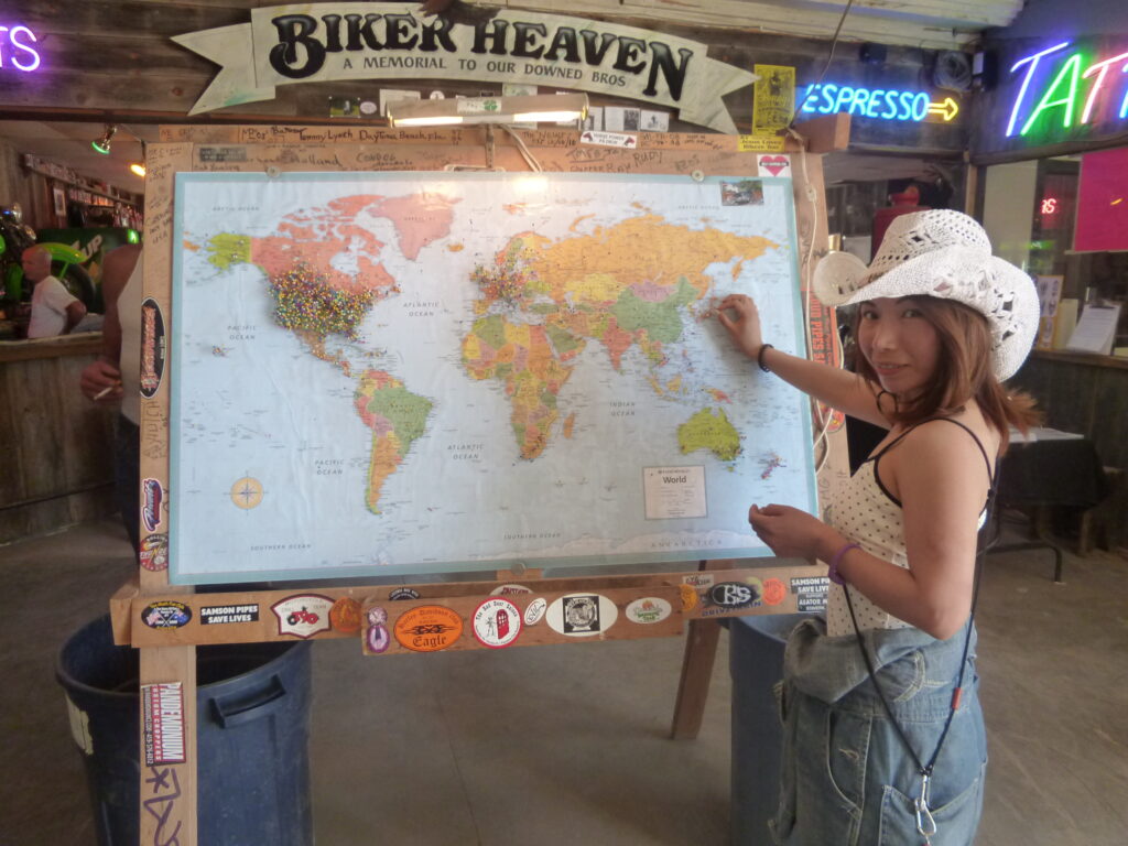 少し離れたブロークンスポークサルーンへ立ち寄ると、店内に大きな世界地図が。